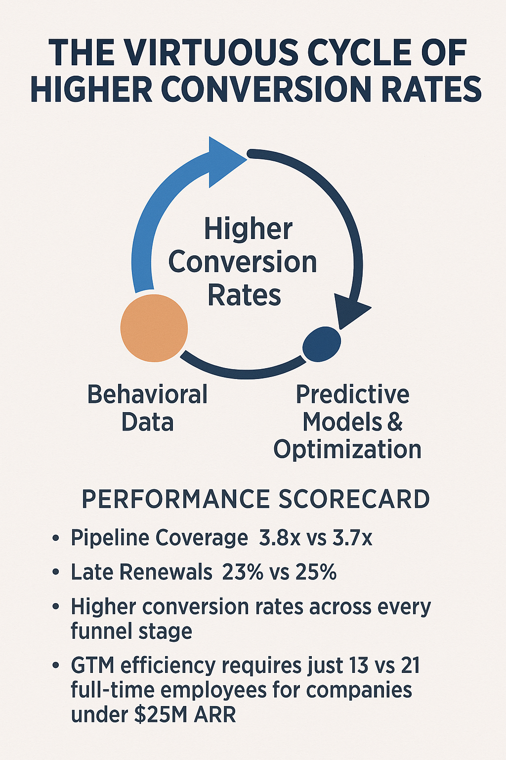 While everyone talks about AI's impact on products, the data reveals its most dramatic effect may be on operational efficiency. Companies under $25M ARR with high AI adoption run GTM organizations with just 13 full-time employees versus 21 for traditional counterparts, which is a 38% reduction in headcount while maintaining or improving performance.